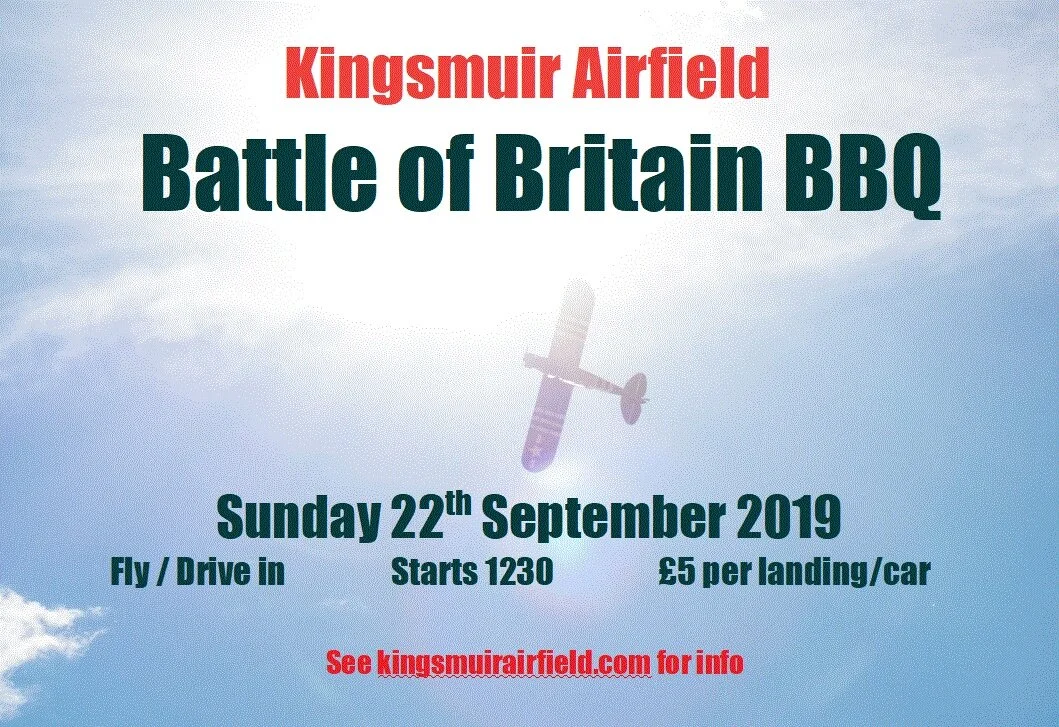 Martin McLaughlin September 15, 2019 Battle of Britain BBQ Martin McLaughlin September 15, 2019 All new and existing pilots are most welcome to join us at this special event to celebrate the anniversary of The Battle of Britain and enjoy Kingsmuir Airfield. Any enquiries please call: 07880 595447